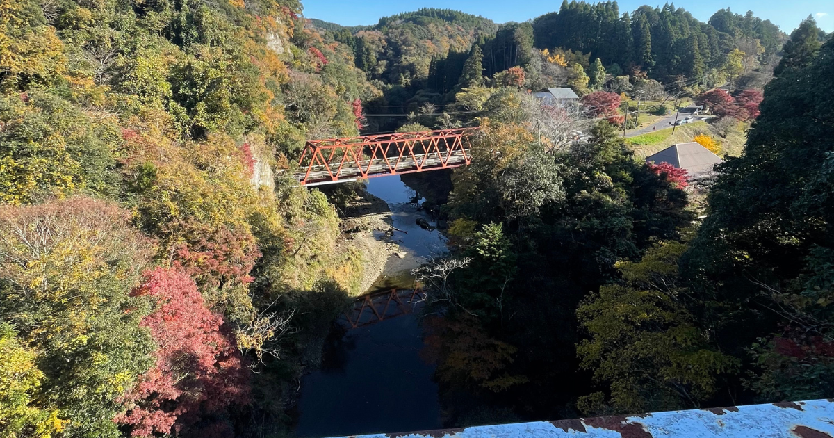 木のトンネルを抜けると、突然現れる赤い橋。真下には養老川が流れ、見上げると青い渓谷橋が見える。渓谷橋へ行くには、さらにまっすぐ進み、田舎の風景をぐるっと回っていく形になる。